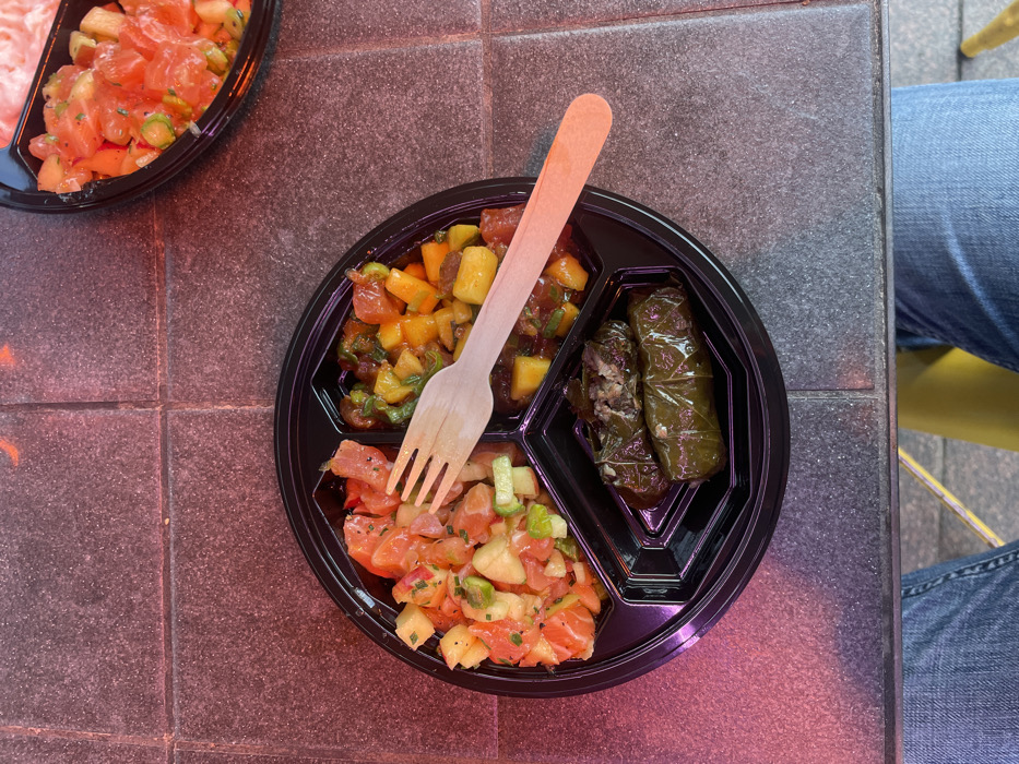 The image displays a meal served on a dark gray tiled table, indicative of a casual outdoor or semi-outdoor dining setting in Copenhagen, Denmark. The central subject is a black, multi-compartment plastic tray containing three distinct food items. The largest section on the left holds a poke-style preparation of diced salmon mixed with green vegetables and herbs. The upper right section contains another poke-style dish, featuring diced mango, a darker protein, and green herbs. The bottom section of the tray holds three dark green stuffed grape leaves (dolmades), one of which is partially split open, exposing a dark, granular filling. A light-colored wooden fork rests diagonally across the upper two compartments of the tray. In the upper right portion of the frame, a segment of a second black bowl is visible, containing a similar diced salmon and green ingredient mixture, alongside a light pink or white creamy accompaniment. The table surface exhibits a reddish-pink illumination, particularly on the left. Below the table, the lower legs of an individual wearing blue denim jeans are visible, along with a partial view of a yellow object, likely a chair component.