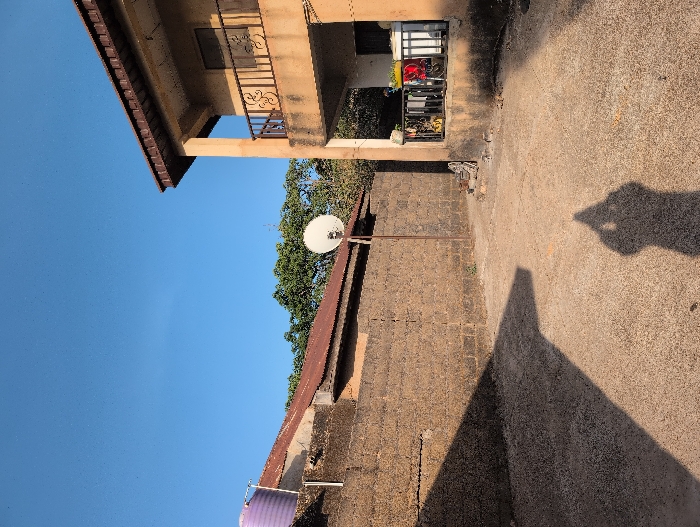 The scene depicts an outdoor residential area in Jos, Nigeria, under a clear, bright blue sky with strong sunlight casting distinct shadows. The foreground consists of an uneven, light brown ground surface, likely compacted dirt or worn concrete, bearing the distinct shadow of a person holding a mobile device. To the left, a textured concrete block wall, approximately 2 meters high, extends diagonally across the midground. Behind this wall, a structure with a reddish-brown corrugated iron roof is visible, along with a purple plastic water tank mounted on a separate support structure on the far left. A white satellite dish on a metal pole stands in front of the block wall. On the right, a two-story building constructed of light brown/ochre-colored concrete or stucco occupies the frame. It features a dark brown overhanging roof structure. The upper floor includes a balcony with dark metal railings adorned with scrollwork. The lower floor also has a smaller balcony or porch area, similarly enclosed by dark metal railings, where various household items are observed, including what appear to be clothes drying racks, white containers, and a red object. Green foliage from trees is visible in the background, peeking above the structures. No individuals are directly visible, save for the photographer's shadow.