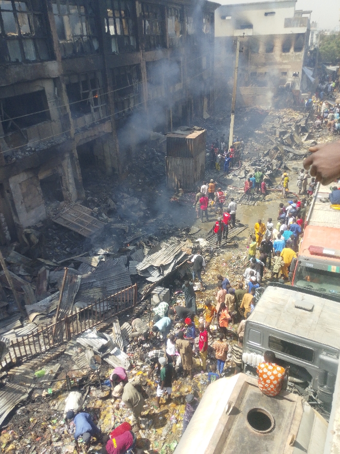 The image depicts the aftermath of a fire event in Fagge C, Nigeria, showing significant destruction across an urban streetscape