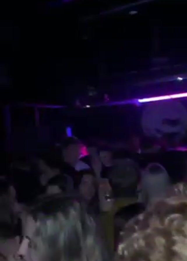 crowded dance floor in a club or music venue. The lighting is primarily blue and purple, with occasional flashes of other colors. People are dancing, their faces mostly obscured by the low lighting and the backs of other dancers. In the background, there's what appears to be a screen with a large, circular graphic on it, but the details are difficult to make out due to the lighting. The camera is moving, giving a sense of being in the middle of the crowd.