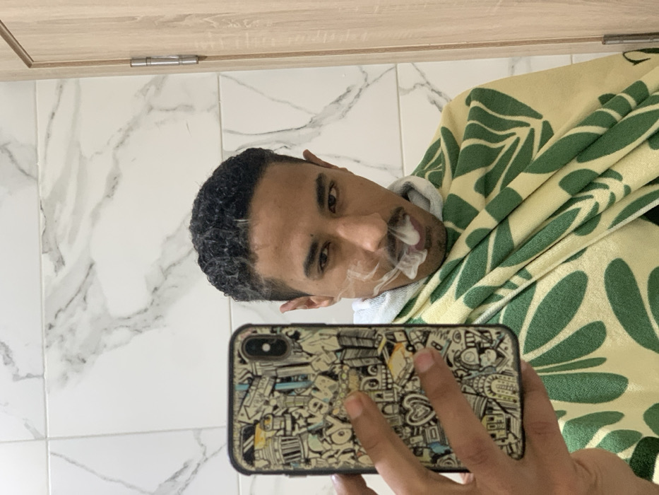 A man is taking a selfie in what appears to be a bathroom. He has curly hair and a trimmed beard. He is wrapped in a green and white floral blanket. Smoke is coming out of his mouth. He is holding a phone with a graphic case that has cartoon doodles on it. The bathroom has marble tiled walls. A wooden cabinet is visible above him.