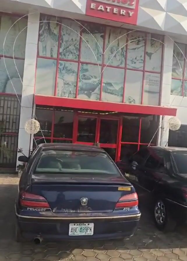 The camera shows the exterior of McHez Eatery with a geometrical white facade and a red awning and window frames. Two cars, a dark blue Peugeot 406 and a black sedan, are parked in front of the building. The windows of the eatery feature food photography. Heart-shaped decorative elements frame the entrance. A sign on the window displays contact numbers for delivery services. The establishment is situated on a paved surface.