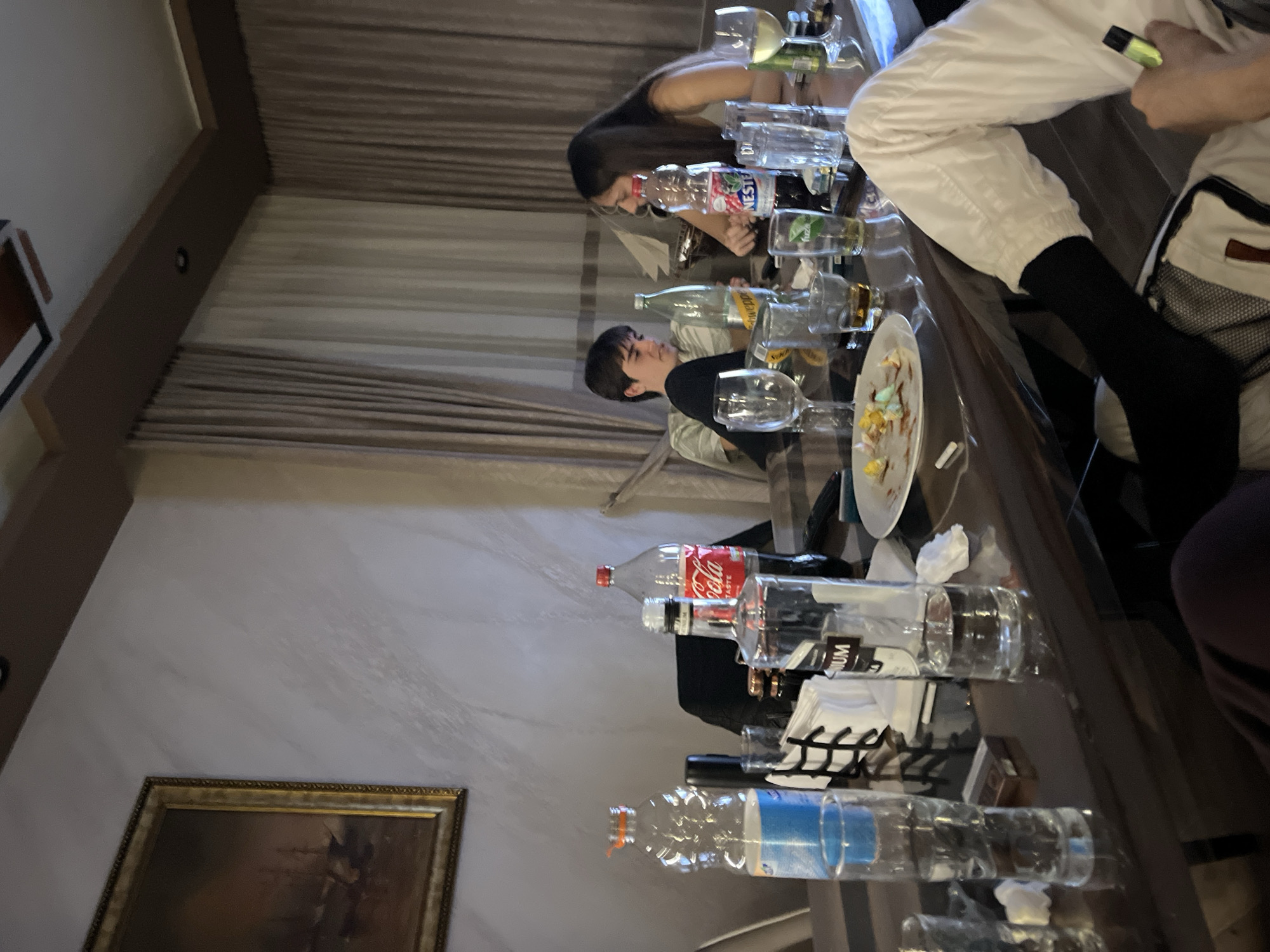 A dimly lit interior shows a long, dark table with multiple people seated. The table is covered with empty water bottles, glasses, and plates with food remnants. Two individuals are prominently visible: one with long dark hair and another with short dark hair wearing a black top. Additional people can be discerned but are less clear. The location appears to be an interior space, possibly a restaurant or dining area, suggested by the arrangement of the table and objects, although the quality of light makes it hard to make a confident assessment of the exact location. The specific location within Ahtopol, Bulgaria is unidentifiable based solely on visual information.