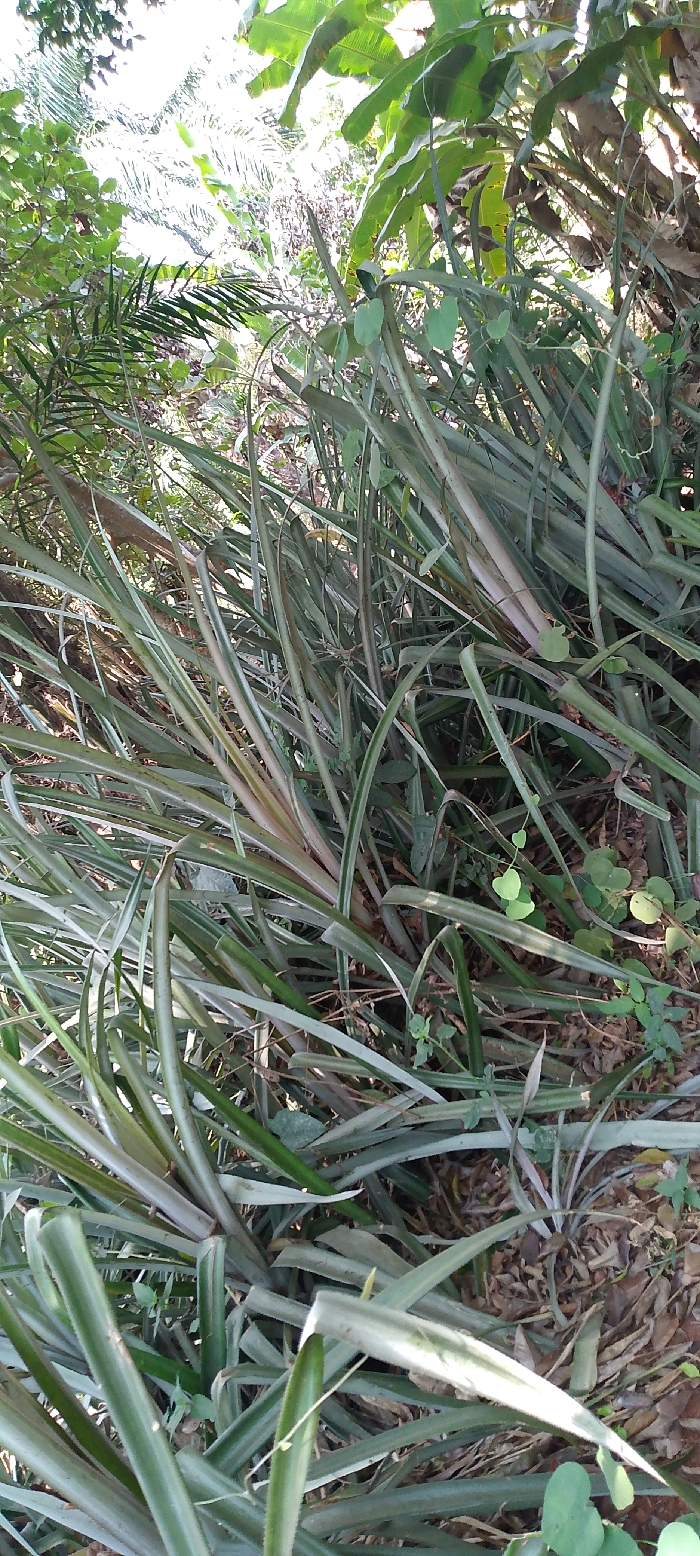 The scene in Okpo, Nigeria, displays a dense aggregation of live foliage, predominantly consisting of plants with elongated, rigid, strap-like leaves, exhibiting variations from pale green to darker green. Several leaves show subtle reddish-brown streaking or discoloration, particularly near their tips and bases. This vegetation is consistent with pineapple plants (Ananas comosus) or similar bromeliad species. The ground visible between the plants consists of reddish-brown soil partially covered by dried organic debris and smaller, lighter green plant growth, including some thin climbing vines. In the background, a variety of tropical vegetation is present, characterized by broad, large green leaves resembling those of banana or plantain trees, and narrower fronds from palm trees. No human figures, animals, or artificial structures are visible within the frame.