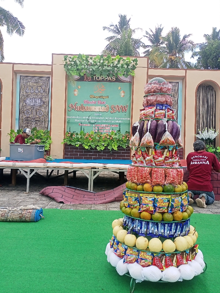 An outdoor scene in Kedung Dowo, Indonesia, displays a multi-tiered conical food arrangement in the foreground, set against a decorated stage and backdrop. The central food structure consists of five main tiers. The bottom tier features white net-wrapped pears and individually packaged "So Yummie" snacks. The second tier holds yellow-green fruits and blue-packaged snacks. The third tier contains oranges and yellow-packaged snacks including "So Yummie" and "Margo snack." The fourth tier is composed of red-packaged snacks, such as "Good Time" biscuits. The fifth tier displays dark purple eggplants, each contained in a clear plastic bag with other vegetables like leafy greens and root vegetables. The uppermost section consists of assorted packaged items, topped by a green, dome-shaped object. This structure rests on a green wire frame, positioned on green artificial turf. Behind the food display, a raised wooden stage is partially covered by blue and red mats. A gray plastic container sits on the stage. A male figure in a red shirt and baseball cap is partially visible on the left side of the stage, appearing to attend to an object within the container. The backdrop consists of a beige wall-like structure with three sections. The central section features a green banner displaying white text, prominently reading "Memperingati Maulid Nabi Muhammad SAW" (Commemorating the Birthday of Prophet Muhammad SAW) and detailing a theme related to emulating the Prophet's morals. Green foliage decorates the top of the banner. The left section shows a decorative panel resembling an ornate door. The right section features an arched recess with a small white floral arrangement at its base. To the right of the food display, a male figure kneels on a paved surface, facing the backdrop. He wears a red long-sleeved shirt with "DEKORASI NURUL-IMAN ARRAHMA" printed in white on the back. He appears to be working on the lower right portion of the backdrop. Overhead, palm trees are visible against an overcast sky. A rolled-up patterned rug lies on the green turf to the left.
