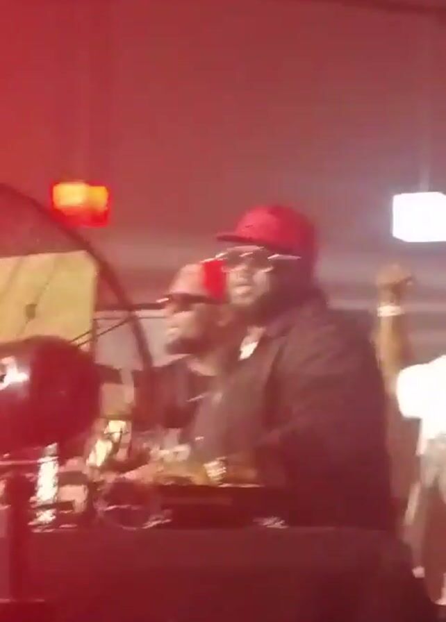 DJ in a red baseball cap and black shirt playing music, with a fan in front of him. Another man wearing a red hat is also visible behind the DJ. There are stage lights above them. The video then transitions to show a bright flash of light on the stage, then the crowd of people in front of the stage, some of whom are holding up their phones to record. The video seems to be taken at a concert.
