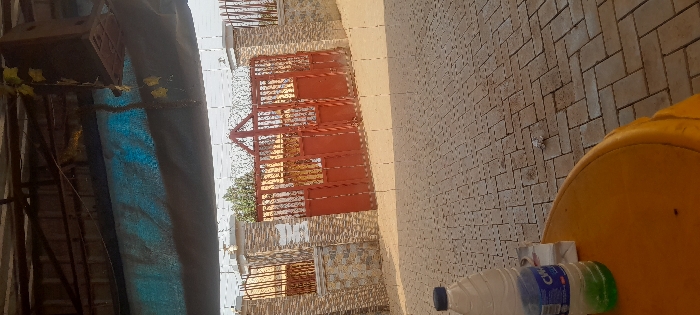 The image depicts an outdoor area in Madalla, Nigeria, observed from a low vantage point, possibly from under a shelter. In the immediate foreground, a clear plastic bottle with a black cap, containing a light green liquid, rests on the left edge of a round, yellow plastic table. Next to the bottle, a small piece of crumpled white material is visible. The surface directly beyond the table is paved with light-colored rectangular interlocking blocks arranged in a herringbone pattern. In the mid-ground, a prominent reddish-brown metal gate, consisting of two hinged sections, stands closed. The gate features vertical bars and horizontal reinforcements. Above the gate, multiple strands of barbed wire are visible. The gate is flanked by two pillars constructed from light-brown, textured masonry blocks, which also form sections of an adjacent wall. The wall on the left side of the gate incorporates horizontal metal grates. Beyond the gate, glimpses of green foliage and a building with a reddish roof are discernible under a bright sky. Overhead, a dark metal framework supports a blue tarp or fabric covering, from which green and yellowish vines with leaves are draped. The scene is illuminated by natural light, casting soft shadows. No individuals or active interactions are present in the frame.