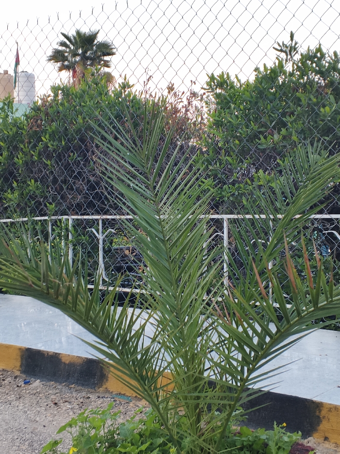 A young palm tree stands in the foreground, its green fronds reaching outwards. Behind it, a white metal fence runs horizontally, backed by lush green shrubs. A taller palm tree with a full crown peeks above the shrubs. The sky is pale, and a chain-link fence stretches across the background. The lower edge of the image shows a gray concrete curb with a yellow stripe, near small green plants on the ground. A flagpole with a visible flag stands left.