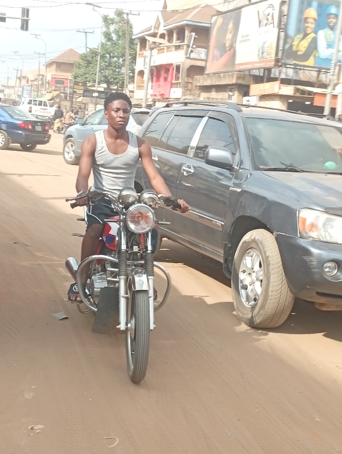 A young man rides a red and chrome motorcycle on a dusty street. He wears a grey tank top and dark shorts with flip-flops. Behind him, a grey SUV is partially visible, along with other vehicles and buildings. A billboard is overhead, displaying images of people wearing hard hats. The scene is filled with daytime sunlight.