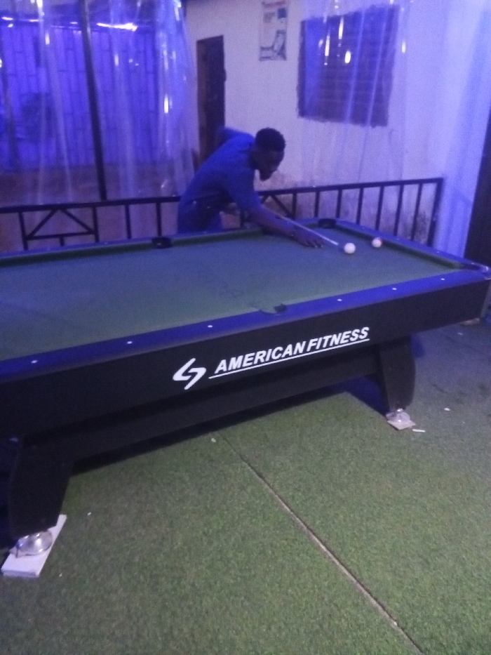 - "A man in a blue shirt plays pool on a green felt table branded "American Fitness" by FM-7f8rh2, licensed under CC BY 4.0