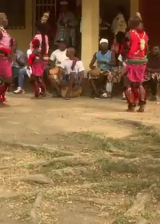 In an outdoor setting, four individuals wearing matching pink and red costumes and head decorations dance to the rhythm of drummers seated on the ground. The dancers, barefoot and adorned with elaborate leg and arm bands, move in unison. Behind the drummers, a group of seated onlookers observe the performance, while others stand near the entrance of a building. The ground is a mix of dirt and sparse grass with exposed tree roots. A banner hangs on the building.