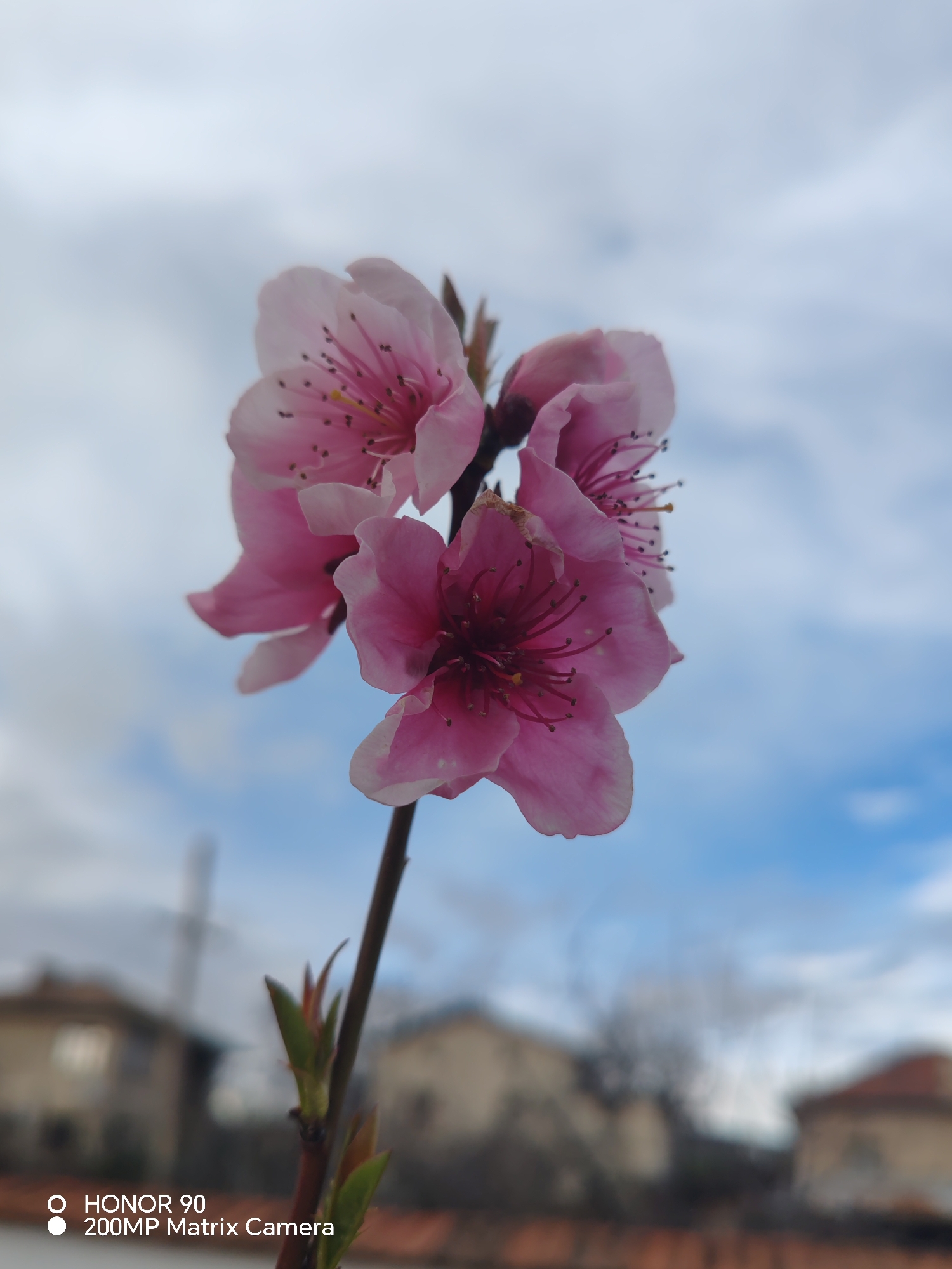 The image displays a sharply focused close-up of a blossoming branch, positioned in the foreground against a blurred background. Five to six vibrant pink flowers with lighter petal edges are visible, each featuring numerous prominent pink stamens tipped with yellow anthers. The flowers are attached to a dark brown stem, which also shows several nascent green leaf buds. The background, largely out of focus, reveals elements of an urban or suburban environment in Rosen, Bulgaria. Distinguishable features include several residential buildings with reddish-brown tiled roofs and light-colored facades, positioned below a sky characterized by a mix of blue patches and white to light grey clouds. A tall, slender, dark vertical structure is faintly discernible in the left-center background. A white digital watermark "HONOR 90 200MP Matrix Camera" is present in the lower-left corner of the image. No people or specific actions are depicted.