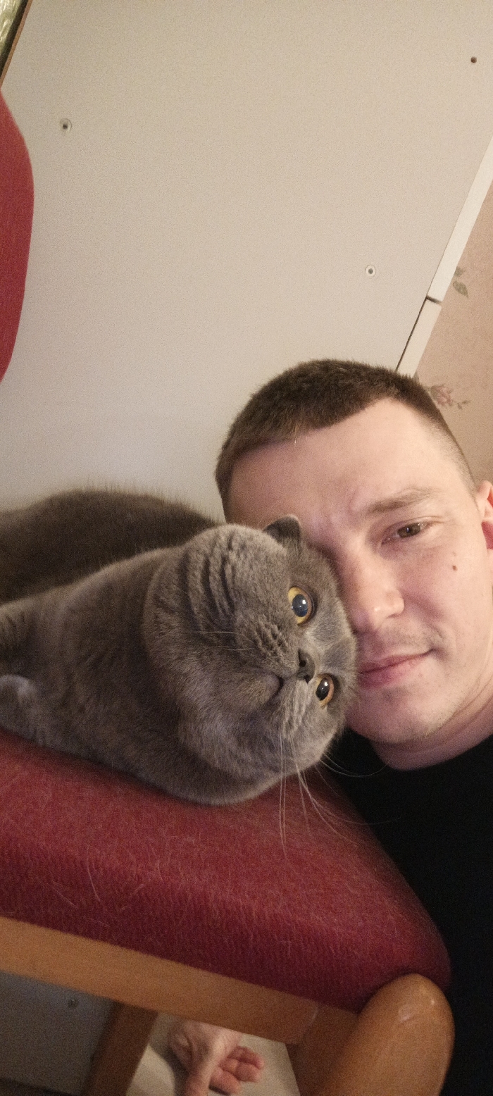 - "An adult male and a gray Scottish Fold cat are depicted in a close-up indoor shot within the city of Марковский, Russia" by FM-AjKBn1, licensed under CC BY 4.0