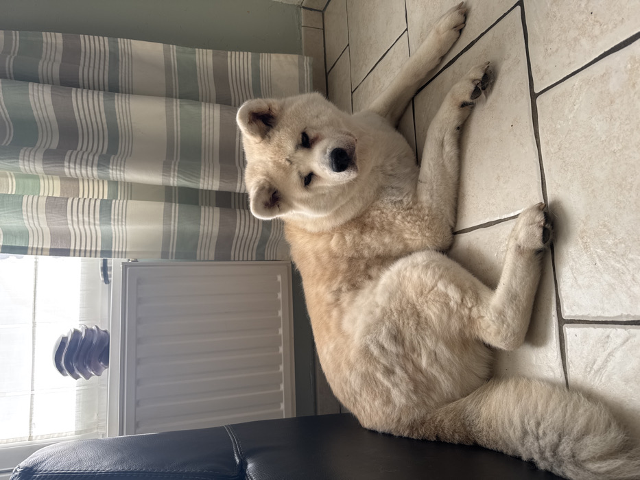 - "A cream and fawn-colored Akita-type dog is depicted lying on a light-colored tiled floor in an indoor setting located in Wattrelos, France" by FM-xTDQG2, licensed under CC BY 4.0