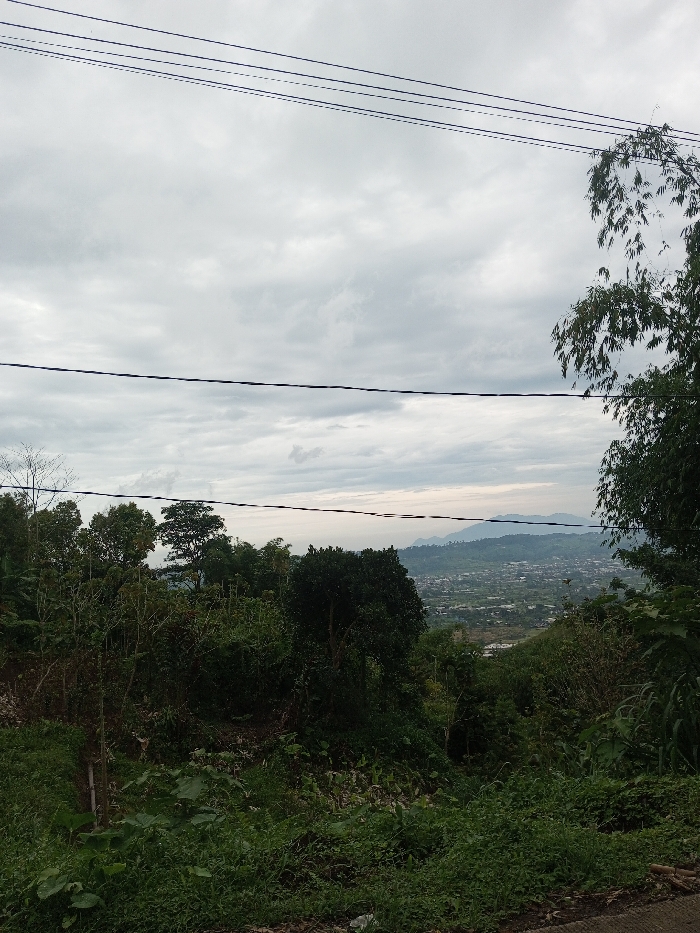 The image presents an elevated panoramic view of a landscape, identified as Hasanparthy mandal, India. The upper third of the frame is dominated by an overcast sky filled with dense grey clouds. Two sets of parallel utility lines, comprising multiple dark wires, traverse the top portion of the sky. The foreground and midground feature dense, dark green vegetation, including various trees and lush foliage, indicating a sloped terrain. A narrow dark strip along the very bottom edge suggests a road or pathway. In the distant midground, a sprawling settlement or town with numerous structures is visible in a valley. Beyond this settlement, a range of hazy mountains or hills extends across the horizon. A cluster of bamboo-like leaves hangs into the frame from the upper right. No individuals, actions, or specific interactions are depicted.