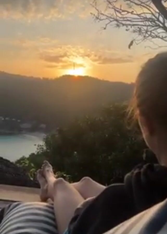 sunset scene overlooking a tropical bay. A person is reclining on a striped cushion on a wooden deck, with their feet propped up. The camera pans slightly to the left, revealing a view of the bay, the water a clear blue-green color. The bay is surrounded by a lush green hillside. The sun is setting behind the hill, casting a golden glow across the sky and water.