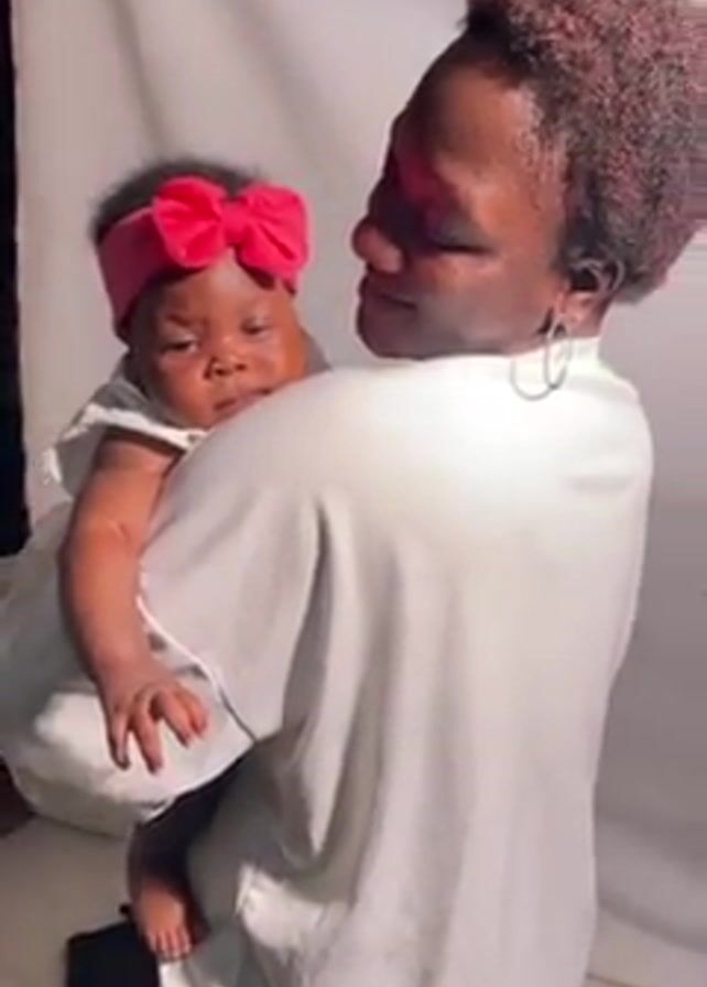 A woman with short, curly reddish-brown hair and silver hoop earrings holds a baby in her arms, both facing to the left of the frame. The baby is wearing a white dress and a bright pink headband with a large bow. The woman is wearing a white top and looking at the baby, who is looking directly at the camera with a slightly sleepy expression. The background is a plain white backdrop, with some shadows and lighting indicating a studio setting. A rustling sound is audible in the background.