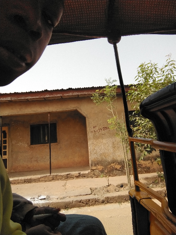 The image depicts an exterior scene in Sabon Tasha, Nigeria, viewed from inside a vehicle, likely a tricycle