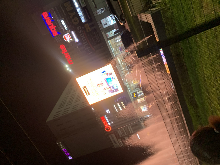 An angled nighttime shot reveals a building adorned with illuminated signs including "upelekki," "marke," "square," "CKING," "FAME GYM," "1-Fitness," "okalidi," "ALDO," "GENESIS," and "Harmon." A large screen displays an advertisement, brightly lit. A chain-link fence runs along the top right, with green grass behind it. A glimpse of a person with a hair tie is visible at the bottom right.