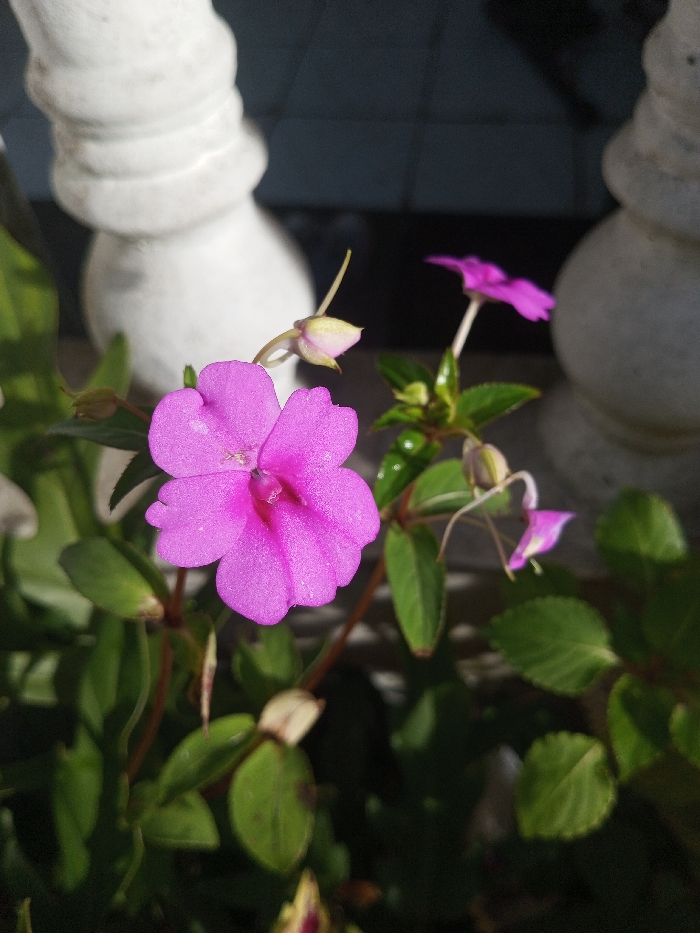 The image displays a close-up of a flowering plant located in Salai Har Htan, Myanmar. A single, five-petaled magenta flower is centrally positioned and in sharp focus, revealing details of its stamen and pistil. Surrounding it are numerous green leaves, several small green buds, and three additional pink flowers or buds, two of which exhibit distinct spurred structures, all varying in their degree of focus. Strong illumination from the upper-left highlights the plant. The background consists of two blurred, light-colored, ornate vertical architectural elements, consistent with balusters or pillars, set against a darker, indistinct area. No individuals or active subjects are present.