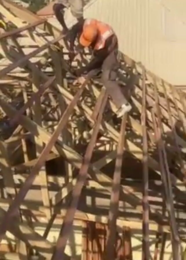 three construction workers on the unfinished wooden frame of a roof