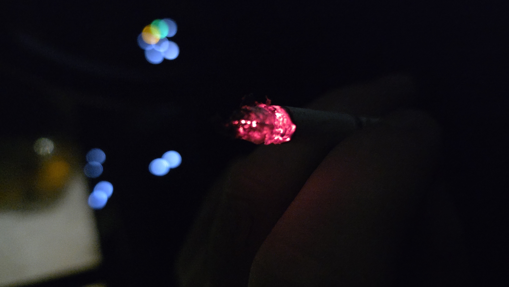 The image displays a lit cigarette in a dark environment. The cigarette's tip is incandescent, emitting a bright red glow from the burning tobacco. It is held by an individual whose fingers are partially discernible in the lower-left portion of the frame. The cigarette paper appears light in color. The background is characterized by significant bokeh, revealing numerous out-of-focus, circular light sources. These lights are predominantly blue, with some yellow, orange, and green points interspersed, indicative of distant artificial illumination, possibly from a city or road at night. The location of this scene is Beringen, Belgium.
