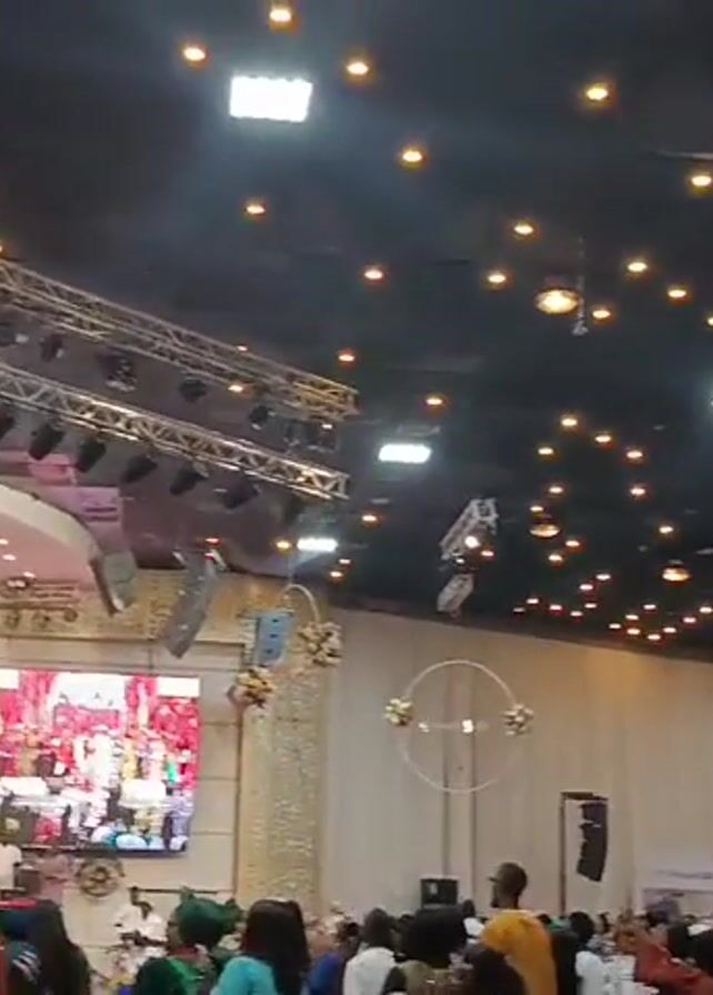 large indoor event space with a stage at one end. On stage, performers in colorful clothing are dancing. Two large screens on either side of the stage show the performance. A large crowd of people, many in traditional African clothing, are watching the performance from the floor. The ceiling is high, with many spotlights and other lighting fixtures. There is a balcony or raised platform at the back of the hall with people standing on it. A sign reading "RETURN" can be seen on the wall near the balcony. The atmosphere seems festive and lively.