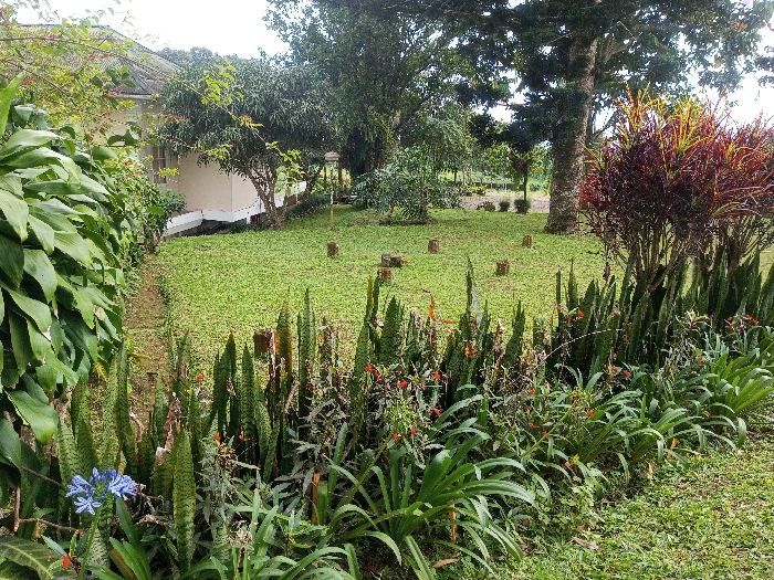 This image depicts a lush outdoor garden or yard in Nghĩa Đồng Commune, Vietnam, under natural daylight conditions. The foreground features a dense array of vegetation, including prominent snake plants (Sansevieria trifasciata) with variegated green leaves, interspersed with smaller plants exhibiting red or orange flower buds. A cluster of blue Agapanthus flowers is visible on the far left. The midground consists of a well-maintained, short-cut green lawn, across which approximately eight small, dark, square or cuboid objects, possibly wooden blocks or stone markers, are evenly distributed. In the background, on the left, a light-colored building with a dark roof and visible window is partially obscured by trees and dense green foliage. On the right, several large trees with thick trunks and dense green canopies stand tall, alongside a large bush displaying distinct red and burgundy leaves. Further into the distance, more greenery is visible under a bright, possibly overcast, sky. No individuals or animals are present in the scene.