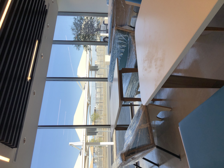 The image captures an unoccupied, modern interior space with panoramic windows overlooking an arid exterior environment, situated in Hanak, Saudi Arabia. The indoor area features a reflective, light-toned floor and a ceiling composed of parallel black slats alternating with white panels, which integrate recessed spotlights and linear fluorescent fixtures. Large, floor-to-ceiling glass windows, separated by dark vertical mullions, form the main exterior wall. Furniture within the room includes several light-colored, rectangular tables with rounded corners and wooden legs. Seating comprises individual chairs with wooden frames and dark metal legs, and longer benches upholstered in blue fabric. A significant portion of this furniture, including chairs and benches, remains wrapped in clear protective plastic film, suggesting a new or unutilized status. A segment of an unwrapped blue upholstered seat is visible in the lower-left foreground. Through the windows, a clear blue sky with a faint contrail is visible. The exterior landscape features a paved area bordered by multiple large, white, tensile-fabric canopy structures, likely serving as sunshades or covered parking. A chain-link fence stretches across the mid-ground, separating the immediate paved zone from more distant, undeveloped terrain exhibiting sparse vegetation. A small tree is visible on the right, partially obscuring a white pickup truck parked in the background. No individuals or discernible activities are present in the scene.