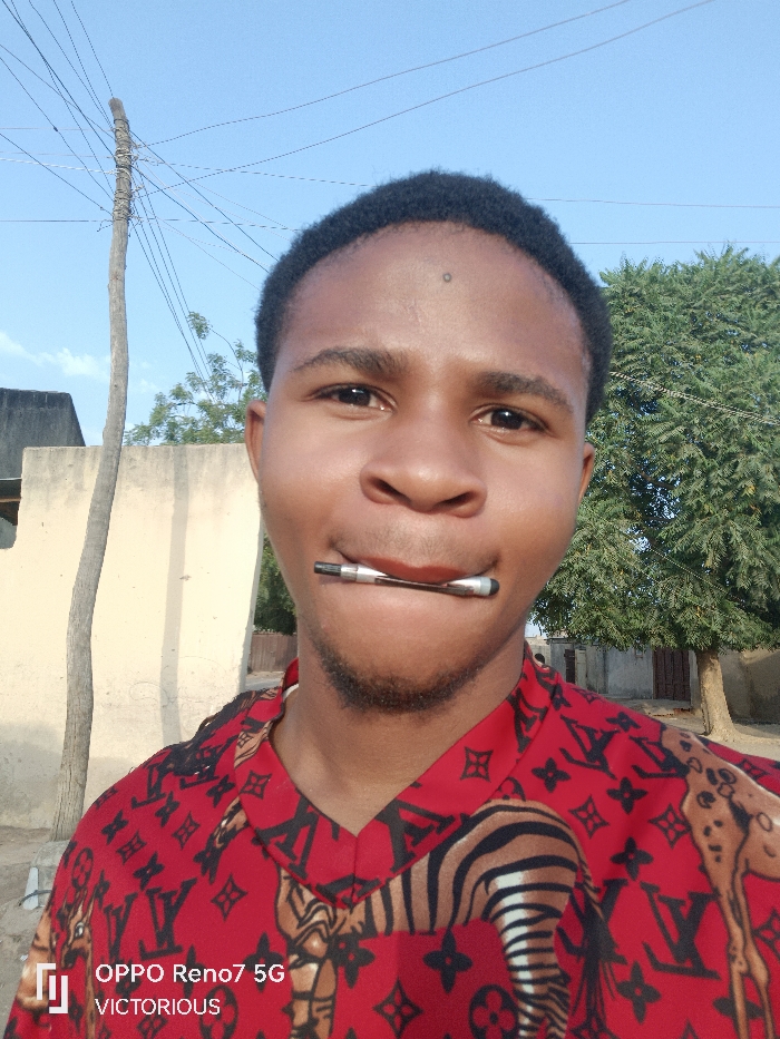 A young man poses for a selfie outdoors. He holds what appears to be a vape pen horizontally in his mouth. He wears a red patterned shirt featuring Louis Vuitton logos and animal prints. Behind him, a utility pole stands next to a pale yellow building. A large tree fills the right side of the background, set against a clear sky. The lower left corner displays the text "OPPO Reno7 5G VICTORIOUS," likely indicating the camera used to capture the image.