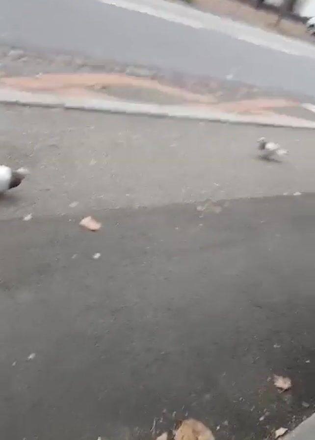 two pigeons walking on a gray asphalt sidewalk next to a street. The pigeons are white and gray, and they are moving around slowly. There are some fallen leaves on the sidewalk, and a car is parked on the street. The background includes buildings and trees.