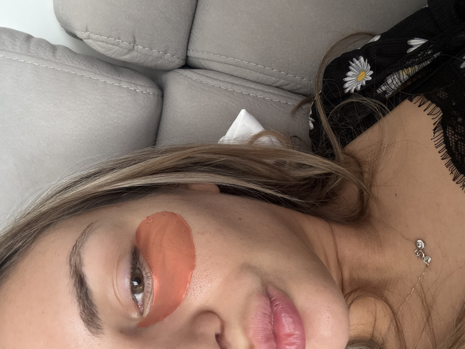 A close-up, selfie-style image shows the right side of an adult female's face and upper torso, taken indoors