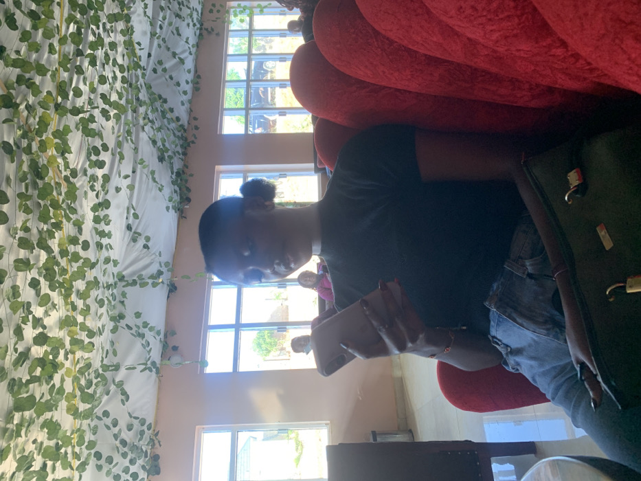 An indoor scene in Kwang, Nigeria, depicts a young woman seated in a red, fluted armchair. She has dark skin, and her hair is styled in two small buns. She wears a dark, short-sleeved top, light blue jeans, and a gold-colored bracelet with red accents on her right wrist. Her left hand holds a light-colored smartphone, which she is observing. Her fingernails are painted dark red. A dark handbag with visible gold-colored hardware rests on her lap. The ceiling is draped with white fabric and adorned with artificial green leafy vines. The room features light-toned walls and multiple rectangular windows, offering a daytime view of an outdoor area with a building, sparse vegetation, a parked dark-colored vehicle, and two partially visible individuals. A dark upholstered chair and a dark reflective surface are also present in the foreground.