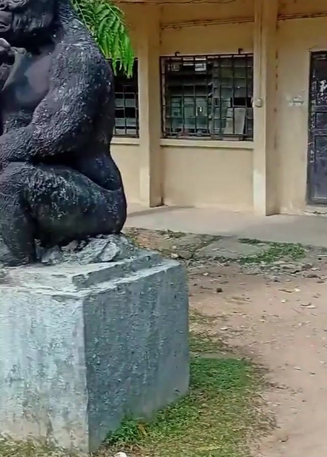 two statues, one of a gorilla and one of a man. The gorilla statue is black and seated on a grey pedestal, with one hand resting on its chin. There is a small tree behind it, and a building with windows and doors in the background. The statue of the man is a bust, and the base has a plaque that reads "THE INDELIBLE PRINTS OF AJIBERO. We dedicate this project to our father PROF. MATTHEW IDOWU AJIBERO". The man's bust is also grey. The surrounding area appears to be a courtyard with dirt ground.