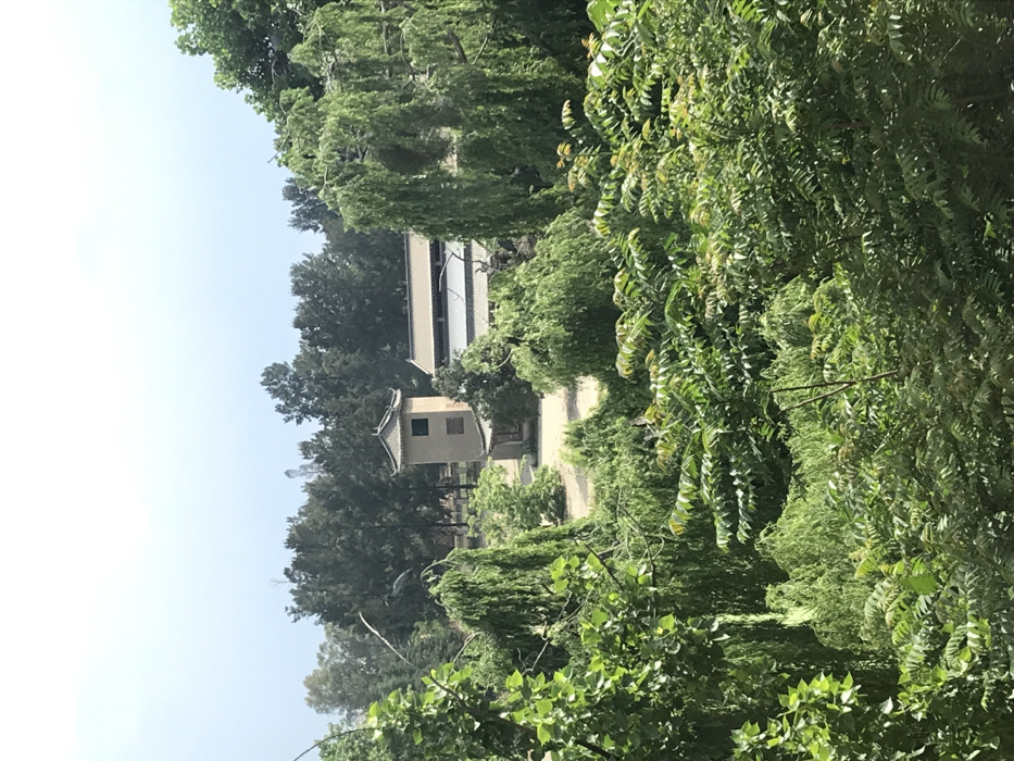 This image presents an elevated view of a green landscape featuring distinct architecture. In the mid-ground, two buildings with traditional Chinese architectural elements are visible. The left structure is a three-story, light-colored tower with a dark, multi-tiered, curved tile roof and dark rectangular window openings. To its right, a longer, single-story building shares a similar dark, tiled roof style. The ground around these buildings consists of light-colored, possibly gravel or dirt, pathways. The scene is densely populated with various green trees and foliage. The foreground is filled with vibrant green broadleaf trees and shrubs, some obscuring parts of the mid-ground. Numerous weeping willow trees, characterized by their drooping branches, are scattered throughout the mid-ground, surrounding the buildings and pathways. Three dark-feathered birds are perched on branches: one on a weeping willow in the upper-left mid-ground, another on a lower willow branch near the taller building, and a third within the dense foliage in the lower-right mid-ground. The background features a thick line of tall, dark green coniferous trees. The sky above is a pale blue, appearing somewhat hazy. The location is the Nan Hua Temple complex, situated near Bronkhorstspruit, within the broader Midrand region of South Africa. No human figures or direct interactions are visible.