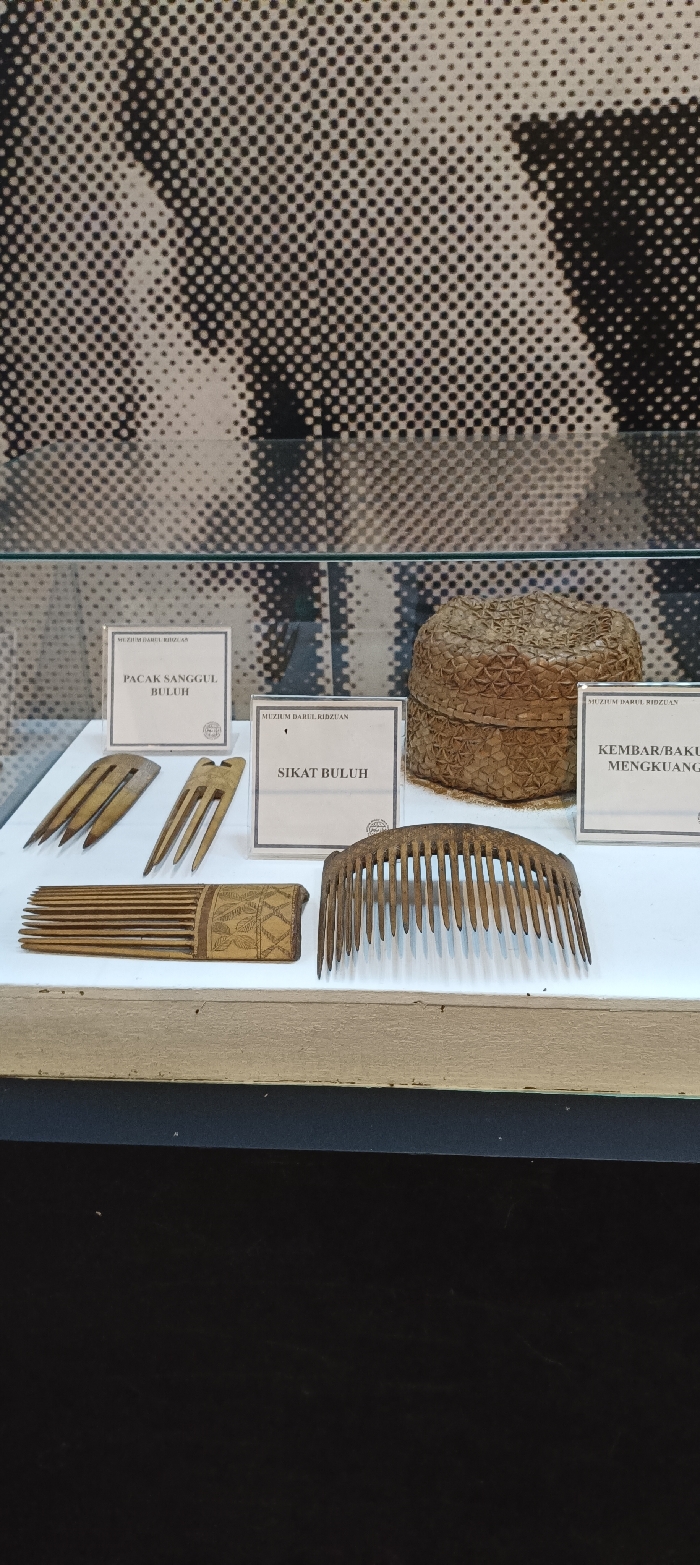 A display case exhibits cultural artifacts. "PACAK SANGGUL BULUH," denoting hair pins, sits beside three wooden hair forks. Adjacent is "SIKAT BULUH," a finely toothed comb, and a decorative comb with etched designs. A woven basket or container, accompanied by a label reading "KEMBAR/BAKU MENGKUANG," completes the display. All are labeled "MUZIUM DARUL RIDZUAN." A patterned backdrop is visible through the glass.