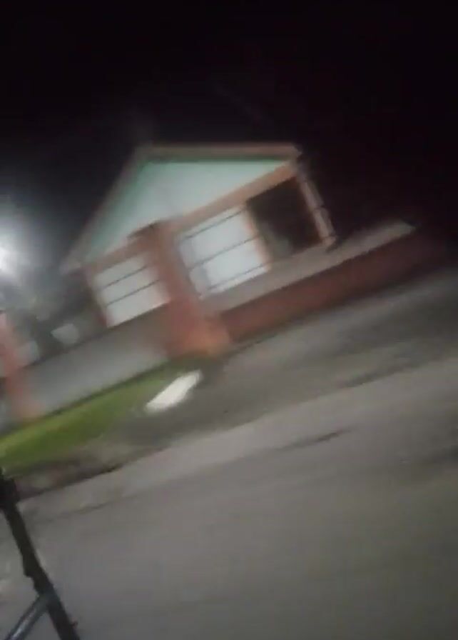 nighttime street scene from a moving vehicle. The street is paved and there are buildings with illuminated windows and green spaces alongside the road. Streetlights are visible, and the camera angle suggests it is taken from inside a car or similar vehicle.