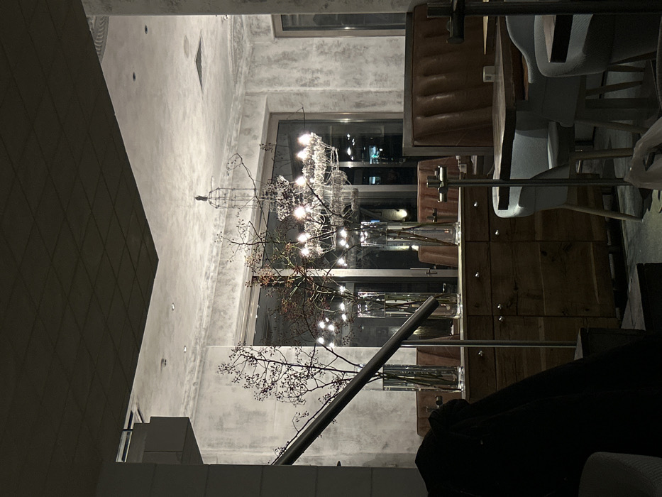 An interior view shows a room with gray textured walls and a prominent chandelier. A window sits behind a set of glass vases, each containing a sprig of berries. A wooden cabinet, topped with seating and chairs, flanks the right. Part of the foreground features a table, a dark jacket, and a glimpse of a white wall.