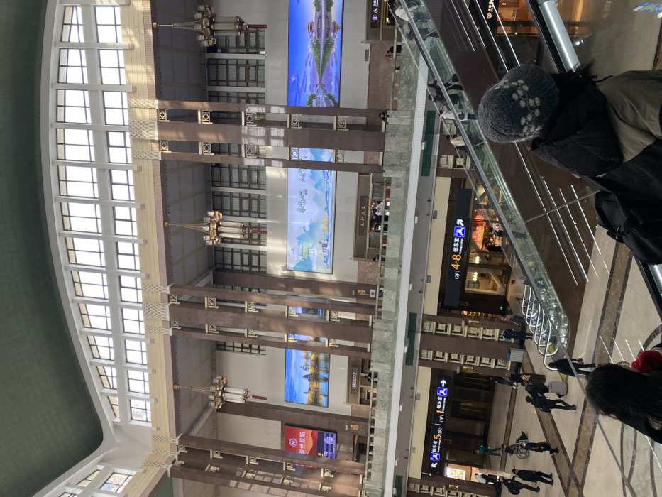 The interior of a grand building features tall pillars supporting a high ceiling with multiple chandeliers. Large screens display landscape scenes. An escalator ascends in the right side of the frame. A sign indicating directions to gates 4-8 and other amenities is visible. Numerous people are visible, some walking on the floor while others use the escalator. The building's architecture blends modern design with classical elements.