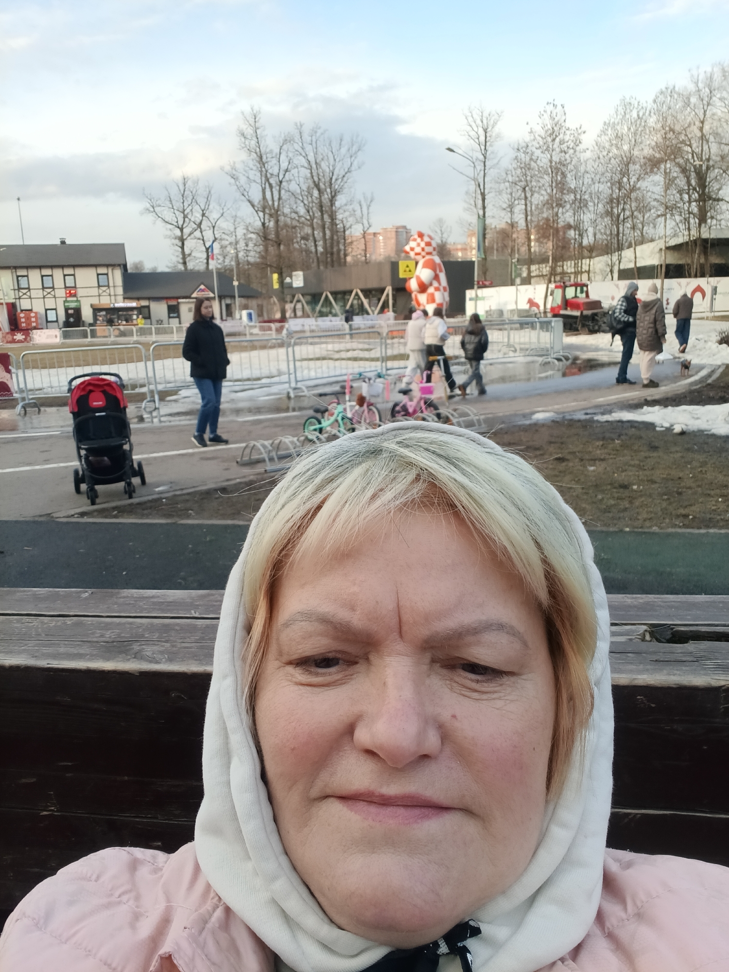 An adult female with blonde hair, wearing a light pink padded jacket and a light cream-colored hood, occupies the lower foreground, appearing to capture a self-portrait. Her face exhibits visible wrinkles. The scene is an outdoor park in Odintsovo, Russia, consistent with Larisa Lazutina Park, under an overcast sky with patches of snow on the ground. In the mid-ground, a red and black baby stroller rests on a dark paved path. A female in a black jacket and blue jeans stands on the path to the left of the stroller. Further right, multiple children's bicycles (pink, green) are arranged near a metal barrier system. Beyond these elements, several individuals in winter clothing are walking or standing. The background features a large, red and white checkered inflatable bear figure, positioned near a red tractor or utility vehicle. To the far left, a two-story building with dark timber framing and white panels, alongside a smaller single-story building, is visible. Bare deciduous trees are interspersed throughout the park. A flagpole displaying the Russian flag stands amidst the trees and distant structures. The ground consists of paved paths, patches of grass, exposed soil, and melting snow. Distant multi-story residential buildings are partially visible through the bare tree canopy.