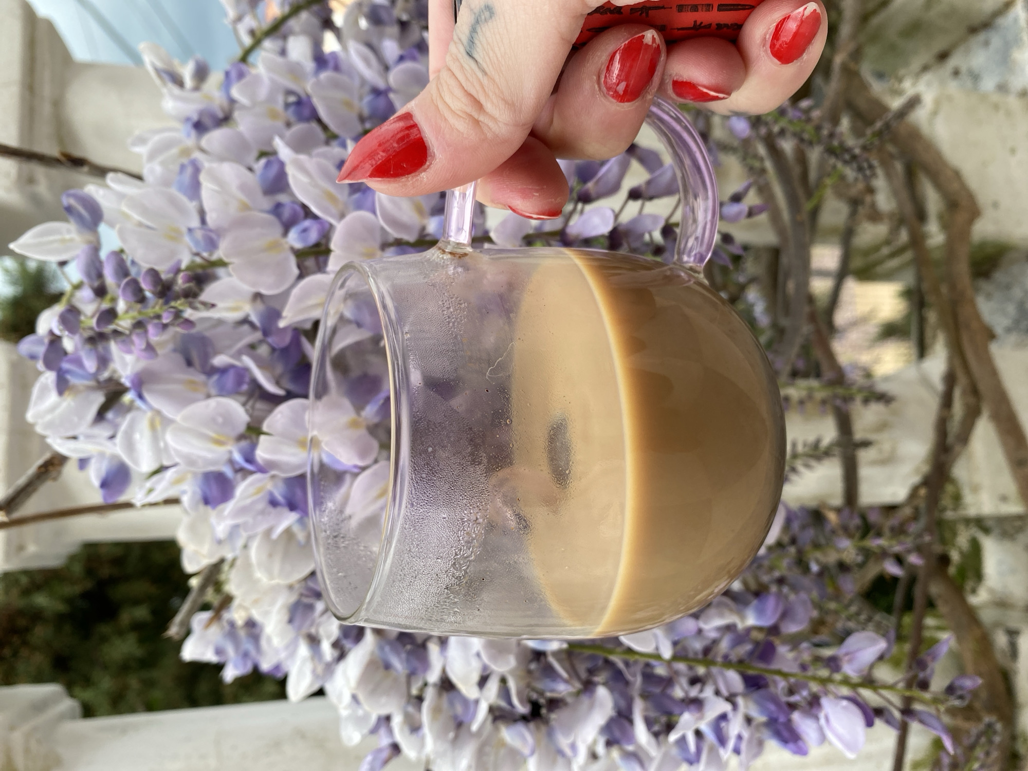 In Kunje, Montenegro, a close-up, outdoor image captures a human hand gripping a transparent glass mug containing a light brown liquid, consistent with coffee and milk. The hand exhibits long, pointed fingernails coated in red polish; a dark tattoo is partially visible on the dorsal surface of the wrist. Condensation is present on the exterior of the mug, and a subtle swirling pattern is visible on the liquid's surface. A red, cylindrical object with black markings is partially clutched by the fingers. The background is dominated by dense clusters of blooming wisteria flowers, primarily white and light purple, some displaying visible moisture droplets. Behind the wisteria, a white balustrade is partially visible, with blurred green foliage in the further distance under an overcast sky.