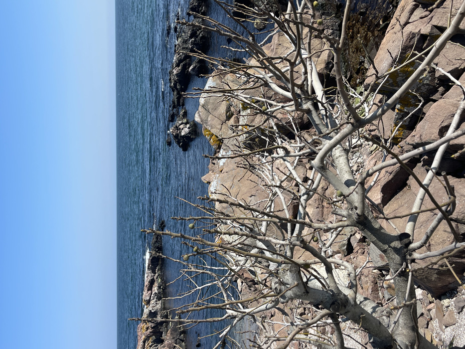 The image depicts a rocky coastline scene in the city of Sozopol, Bulgaria, under a clear blue sky. In the immediate foreground, a dense network of bare, grey-brown branches from a deciduous plant, likely a fig tree, occupies the lower half of the frame. Several small, green, immature fruits are visible on these branches. The plant is situated on a rugged shoreline composed of large, reddish-brown rocks, some displaying patches of yellow-green lichen. Beyond the rocks, the dark blue-green sea extends to the horizon under a pale blue sky. Several darker rock formations protrude from the calm water in the mid-distance. A small, white bird, consistent with a seagull, is perched on one of the larger rocks in the water to the right. No human figures are present. The sunlight casts distinct shadows, indicating a bright, clear day.