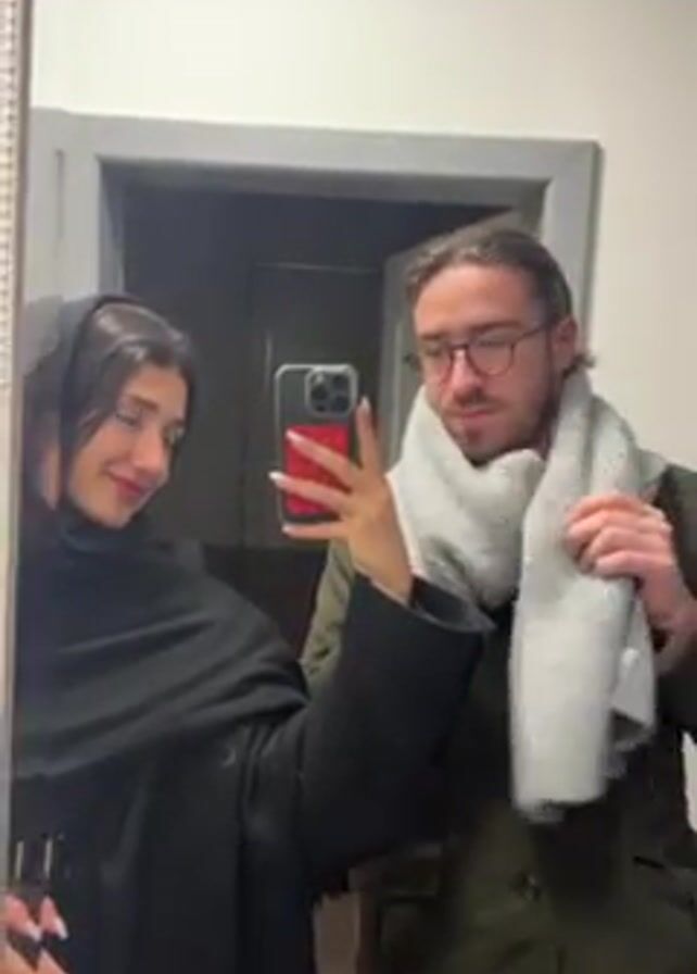 In a medium shot, a woman and a man are posing for a selfie in front of a mirror. The woman, who is on the left, is wearing a black shawl that covers her head and a black coat. She is holding a smartphone in her right hand to take the picture. The phone case is red. The man, on the right, is wearing glasses, a gray scarf, and a green jacket. He is adjusting his scarf with his right hand. The background appears to be a room with a doorway and white walls. The lighting is moderate, and the overall scene seems casual and informal.