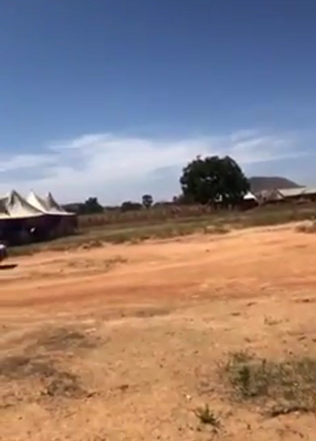 rural area on a sunny day. The ground is dry and reddish-brown, with sparse vegetation. A few simple buildings are scattered in the distance. The camera pans to reveal a cluster of white tents with purple trim, then to a pickup truck parked nearby. The camera continues to pan, showing more of the surrounding landscape, including a larger building in the distance. The sky is clear and blue with some wispy clouds.