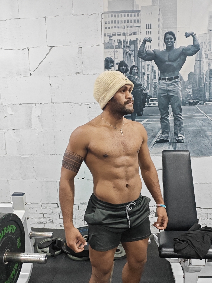 This image depicts an indoor gym environment located in Shapingba District, China. A muscular adult male stands centrally in the foreground, facing slightly right with his gaze directed off-camera to his left. He has dark skin, a beard, and a mustache, and wears a light beige ribbed knit beanie and dark shorts with a gray drawstring. He is shirtless, displaying a toned physique with visible abdominal muscles and a patterned band tattoo on his upper left arm. A silver-colored chain with a small cross pendant hangs around his neck, and a light blue and pink wristband is on his left wrist. The background features a white-painted brick or block wall with visible wear and cracks. To the right of the subject, a large black and white poster or mural covers part of the wall, depicting a street scene with buildings and a prominent figure resembling Arnold Schwarzenegger posing, flanked by other individuals. In the left foreground, a barbell with green-rimmed weight plates is visible on a white rack. To the right of the subject, a black upholstered weight bench with a white frame has a dark piece of clothing draped over it. The floor is covered with dark gym matting, and additional weight plates are visible on the floor in the mid-background.