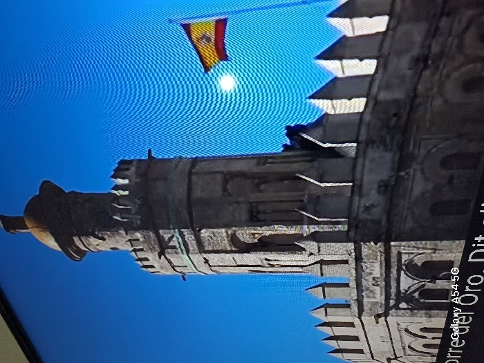 The photo depicts the Torre del Oro in Seville, Spain, under a clear blue sky. The tower, with its distinctive crenellations, is constructed of stone and topped with a dome. The Spanish flag flies in the background, illuminated by the sun. Part of a phone menu is visible at the bottom right of the photo.