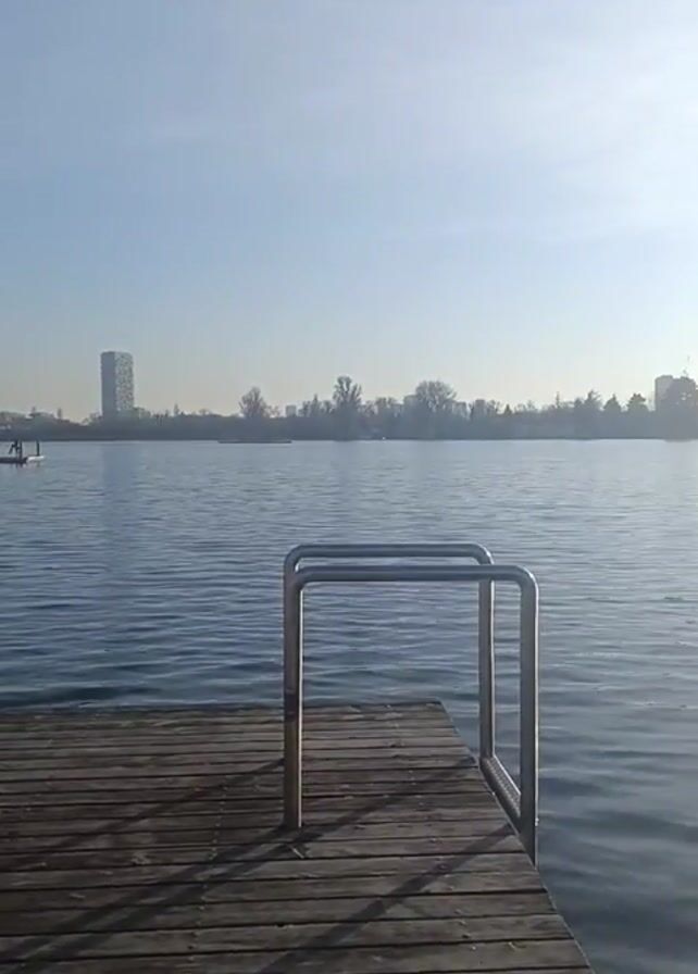 calm lake on a bright, sunny day. The camera is positioned on a wooden dock, with metal railings visible. The water is slightly rippled, reflecting the sunlight. In the distance, there is a cityscape with trees and a tall building. The sky is mostly clear and blue, with a few clouds. The sun is bright and creates a glare on the water. There are some reeds growing near the dock on the left.