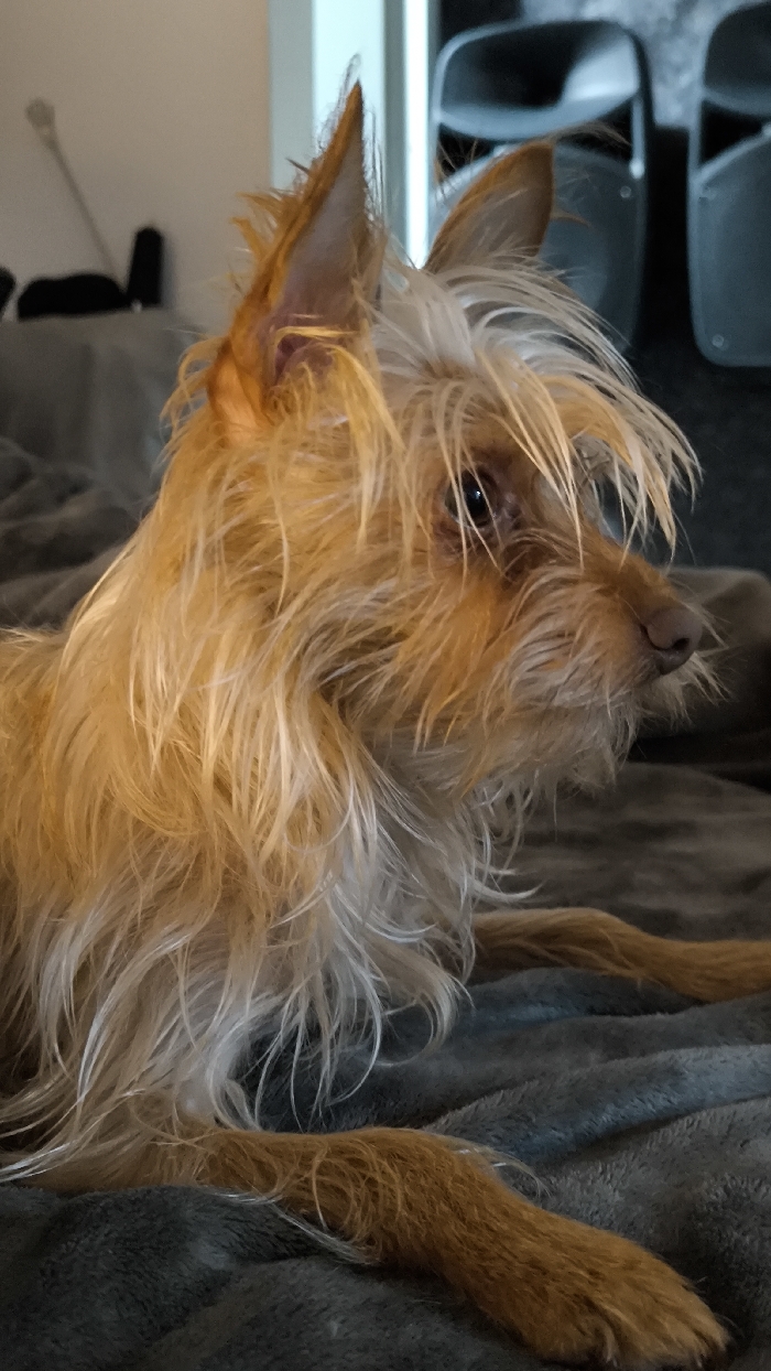 The image displays an indoor scene in Ripollet, Spain. A small dog with shaggy, multi-toned fur, predominantly golden-brown to light blonde, is centrally positioned. The dog is lying in profile, facing towards the right side of the frame, with its front paws extended. Its eyes are dark and partially obscured by dense facial hair, and it possesses a dark brown nose and erect, pointed ears. The dog rests on a dark gray, textured blanket. The background is out of focus: to the left, a light-colored wall is visible, with a dark, indistinct object and a slender, stick-like item leaning against it. To the right, two dark chairs with curved backs are partially discernible against a lighter background.