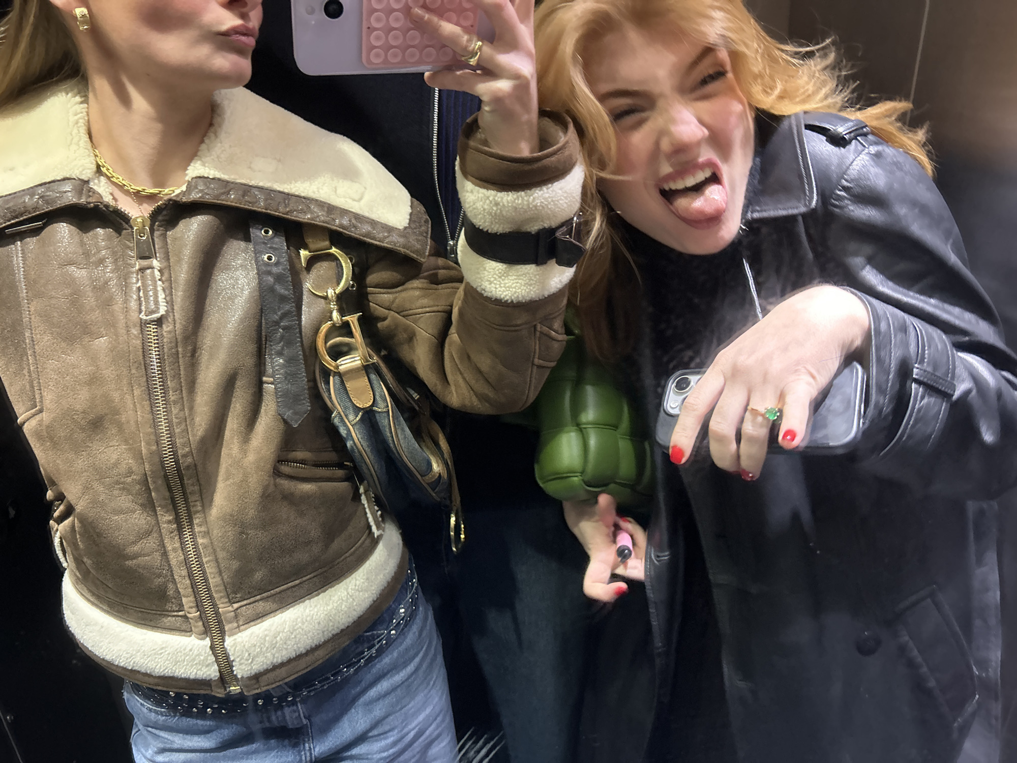 In an indoor setting, two young women are capturing a selfie. The woman on the left is wearing a brown bomber jacket with white fur trim, a gold chain, blue jeans with a studded belt, and is accessorized with gold earrings. A navy blue purse with gold hardware is slung over her shoulder. The woman on the right is dressed in a black leather coat. She has red nail polish, wears a green ring, and is sticking her tongue out in a playful expression. In her hand, she is holding an ecig. The overall composition is candid and close-up.