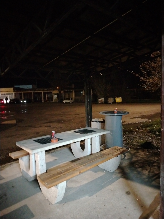 The image depicts an outdoor scene at night in Targovishte, Bulgaria, under dim artificial lighting. In the foreground, a concrete picnic table with two integrated wooden benches is positioned beneath a dark, open-sided shelter featuring a metal truss roof. The tabletop, which incorporates two recessed dark grates, holds a red and silver beverage can and a small orange container. To the right of the table, a tall, grey cylindrical object with a flat top, resembling an industrial spool, supports another identical red and silver beverage can. A dark trash bin is partially visible behind this object. The ground in the mid-ground and background appears wet and uneven, indicative of recent precipitation. An unpaved parking area extends into the background, occupied by several parked vehicles, including a white BMW sedan visible towards the center-left. Distant building facades with some illuminated windows are discernible behind the vehicles, and vehicle lights reflect on the wet surface. Towards the right background, three industrial waste bins—two grey and one yellow—are present. Bare tree branches are visible on the far right. No individuals are depicted in the scene.